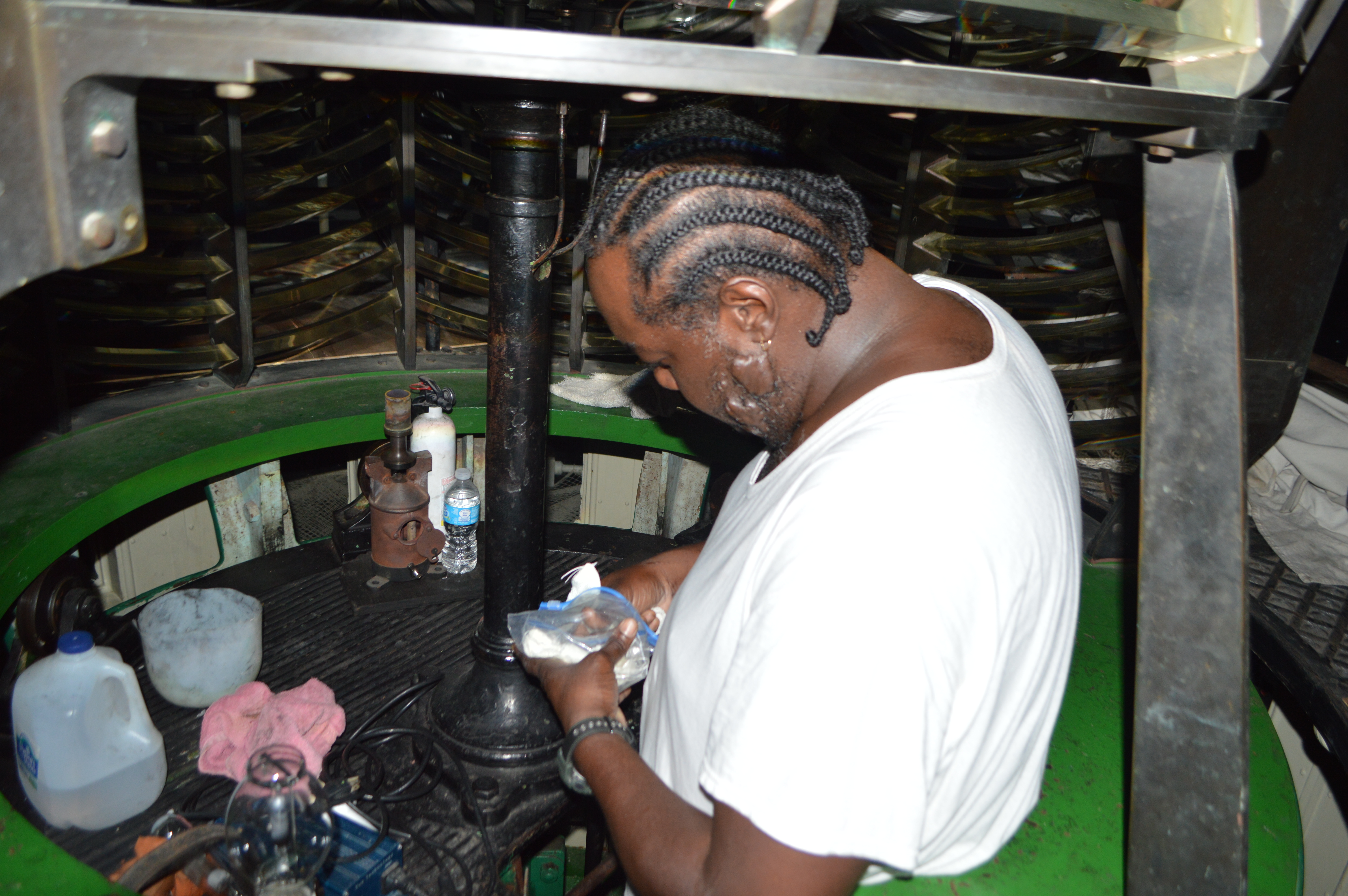 Jeffrey wakes up every 2 hours at night, climbs the lighthouse and cranks the weight system so the lighthouse light keeps turning.