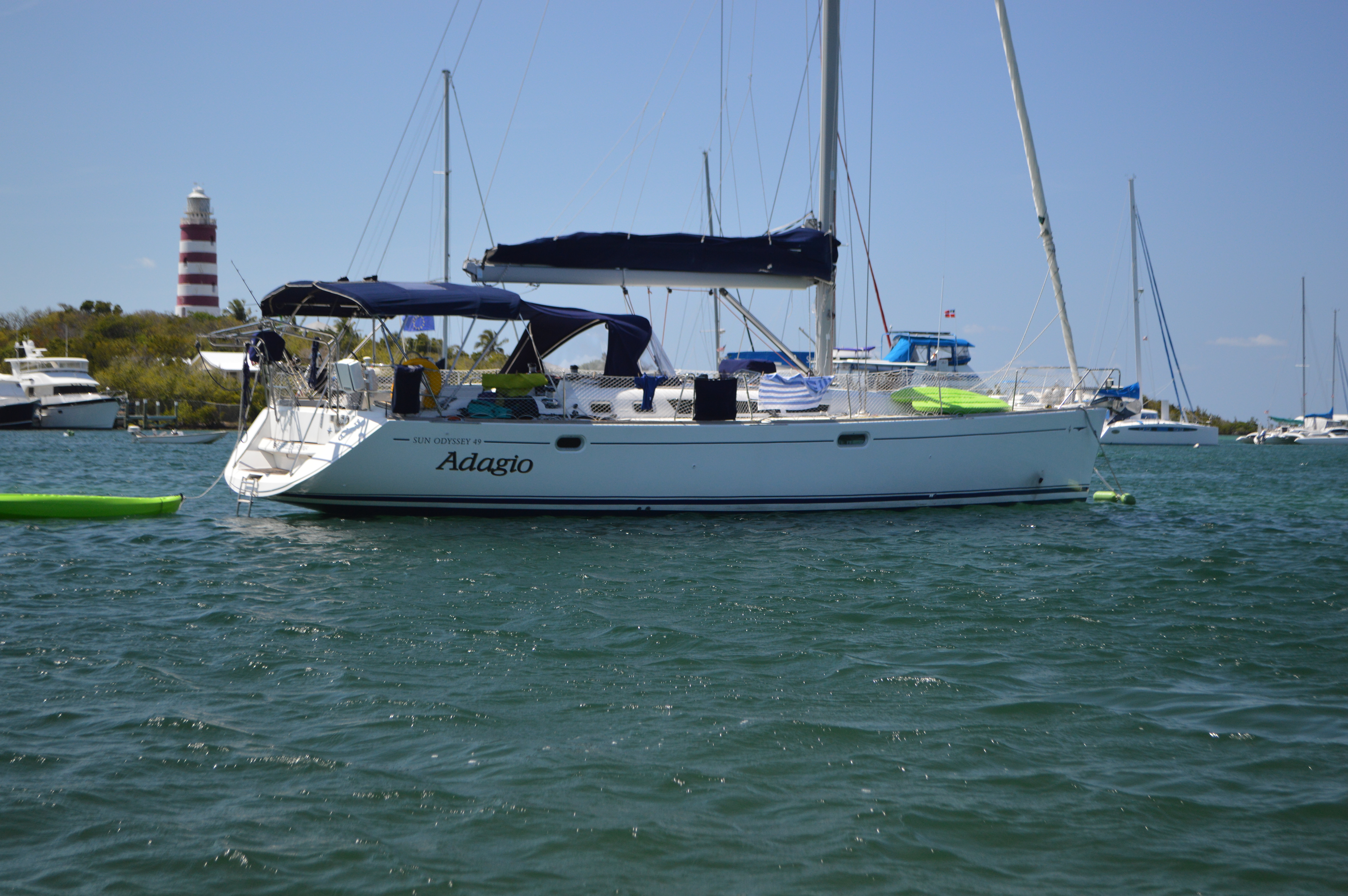 DSC_0244But let me take a step back.  When we pulled into the harbor a week and a half ago the current was rippin’ and the wind was a blowin’.  I started at the helm while Marc was at the bow trying to pick a good mooring ball.  Maria was having a temper tantrum which added to the chaos onboard.  With Maria’s screaming, the current and the wind, I got all flustered.  I don’t think any prophanities slipped from my mouth, but Marc could sense it was time to switch places.  So Marc came back and took the helm and I tried to pick up a mooring ball line.  Whenever someone new pulls in, the other cruisers love to watch the newbie get the mooring ball.  With strong wind and current it is always a sight.  We like to call it “Harbor tv”.  Since we were the new kids on the block in the harbor, all eyes were on us and my anxiety level skyrocketed.  Marc, no surprise was as cool as a cucumber.  As I’m leaning over the bow with the boathook, trying to pull the first mooring line aboard, the current was pulling the boat away.  Luckily out of nowhere (it was like a mirage), a local man on a small aluminum boat appeared and handed me the mooring line.  Turns out it was Truman, who owns the mooring ball.  He said “Welcome to Hope Town.  Stay on the mooring as long as you want and just drop off the money you owe me on my boat when you head out of town.”  The mooring balls are owned by various businesses and individuals and you pay them a small fee to keep your boat there.  Truman saved the day, I got the mooring lines attached to our bow cleats and I settled in the cockpit with a big glass of wine.  We then ran into Truman again when we went to Catholic mass Sunday at the local playground and Truman was the deacon!  He’s a jack of all trades.