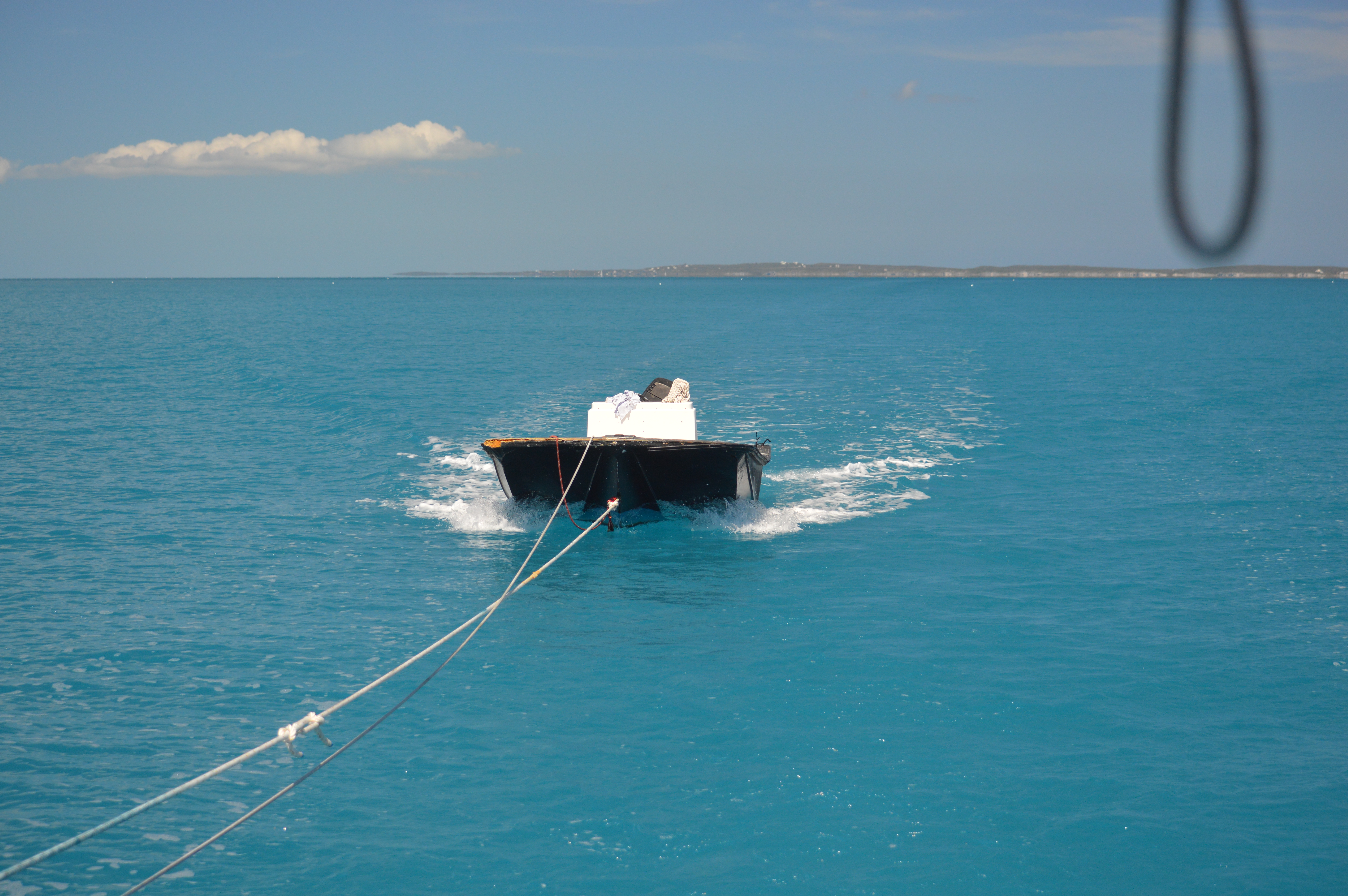 When we left Hatchet Bay, we ended up taking Ben’s boat with us and pulling it behind Adagio. Ben is giving his boat to Donald (read about Donald and Ben in the last post), Donald is building a boat for Ben…maybe? (I got a little lost on all the transactions), and Donald in the meantime had our dinghy in his backyard down in southern Eleuthera. All three of us were switching boats, batteries, and gas tanks around that it all got confusing for me. Luckily Marc knew what was going on. Ben’s, well now Donald’s, boat is a tank compared to our dinghy so it slowed us down about a knot. There was virtually no wind as we were heading south, but luckily we had plenty of daylight hours and plenty of fuel. Or so we thought.