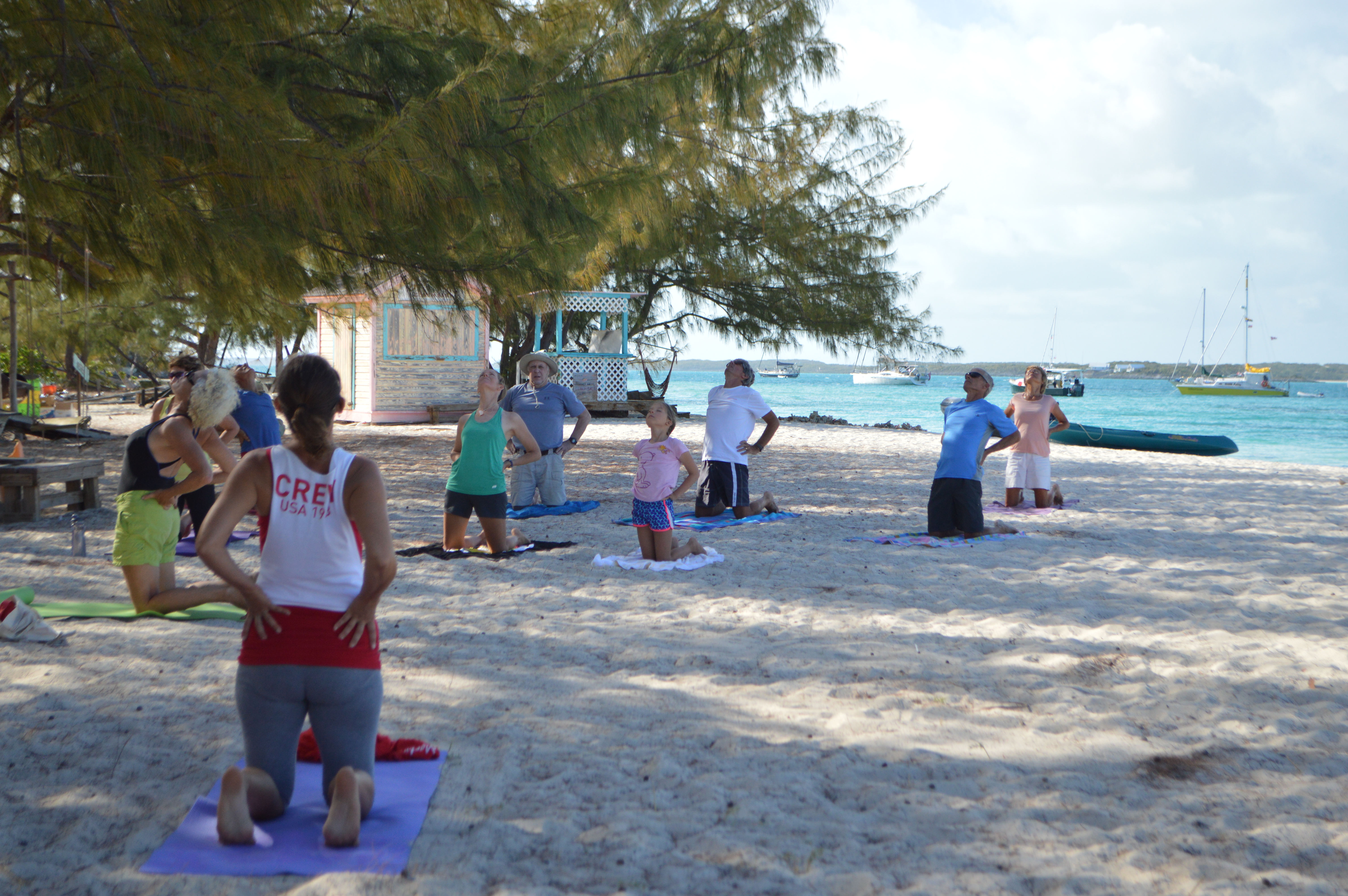 I also come to yoga at Volleyball Beach in the morning if I do my math, spelling and handwriting the night before. The first time I did yoga I fell off my towel and got sand in my hair. And at the end of the class when I’m supposed to be laying down and relaxing, I get a little bored and sometimes start playing in the sand.