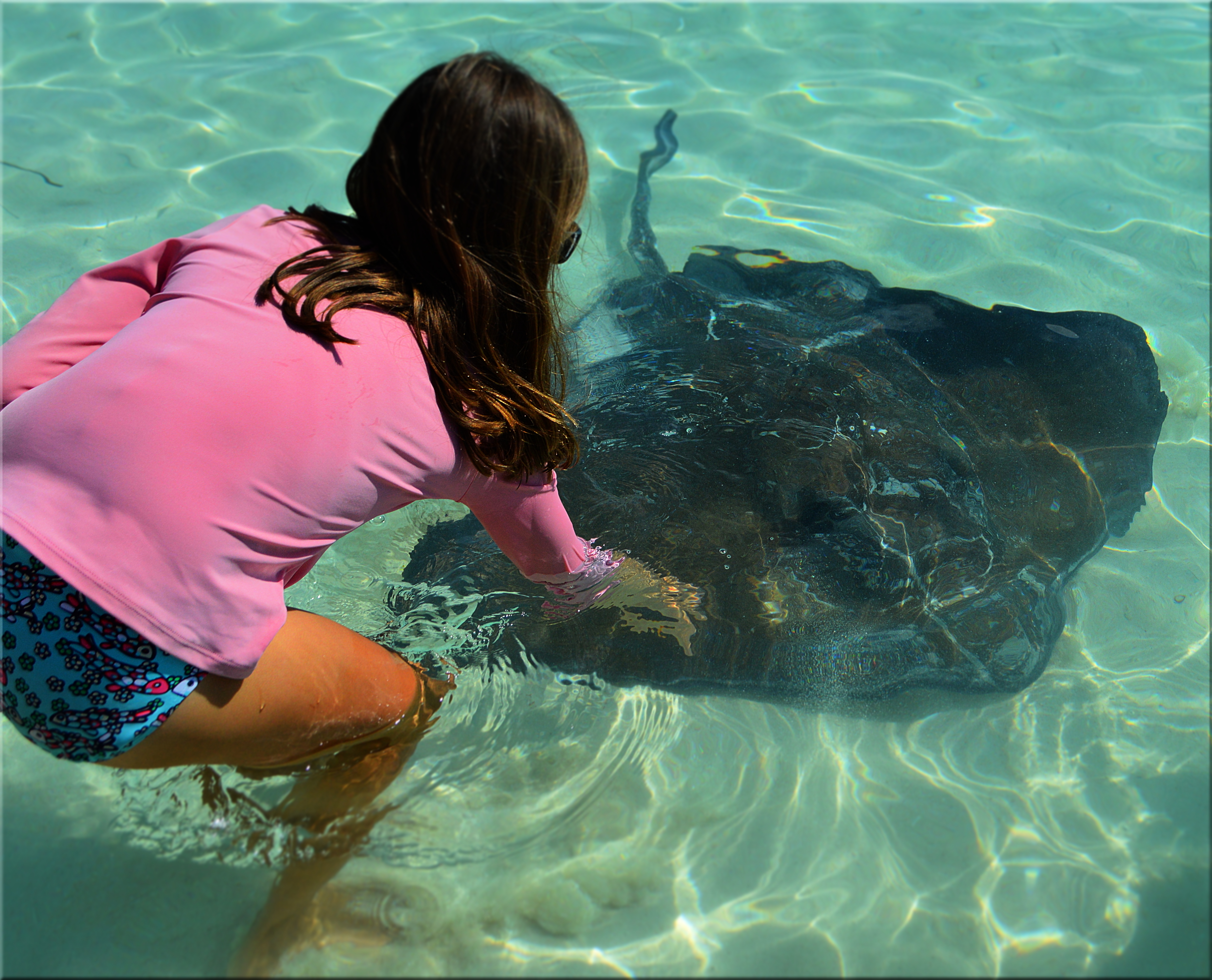 At Volleyball Beach my favorite thing to do is pet the stingrays. Some are silky and some feel like rocks. Once there was a baby stingray attached to the mother stingray. The baby was upside down on the mommy’s belly. It was really cool to look at.